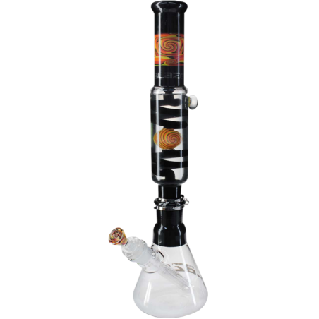 Diese formschöne Blaze Glass Coolbong besteht aus zwei Teilen. Dem Unterteil mit doppelt verstärktem Schliff und dem Rauchrohr mit einer Kühl-Spiralkammer, die im Tiefkühlschrank vorgekühlt werden kann. Das Design dieser Coolbong enthält bunten Sektionen und ist ansonsten elegant schwarz gehalten. Nur die Wasserkammer ist klar und mit dem silbernen Blaze Glass Logo verziert. Ein Doppel-Diffusor-Adapter ist ebenfalls dabei. Der 1. Adapter hat einen 5-armigen Baumdiffusor und der 2. besteht aus einem 12-Schlitz-Diffusor. Dies sorgt für mächtig Verwirbelungen, kühlt den Rauch optimal ab und filtert den Rauch vor. Inklusive Schliffklemme.