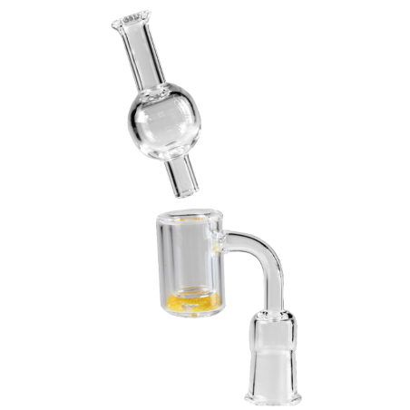 Das Dabbing-Set in der schönen Metalldose enthält einen Banger und einen passenden Carb Cap aus sehr hitzebeständigem Glas. Der Banger enthält ein gelbes Farbgranulat, dass rot wird, wenn der Banger erhitzt wird.