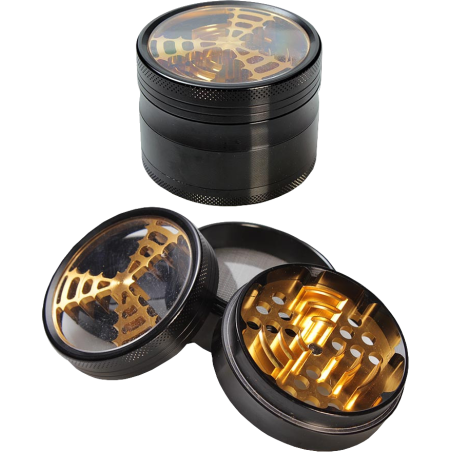 The black grinder Mill aluminum with viewing window has a golden-colored grinder in the design of windmill blades with rotor blades for crushing. The edges in the bottom chamber are rounded, so that the finely ground material with the scraper reminiscent of a plectrum can be emptied almost residue-free. The grinder has a magnetic closing lid, nylon slide ring and an integrated sieve.