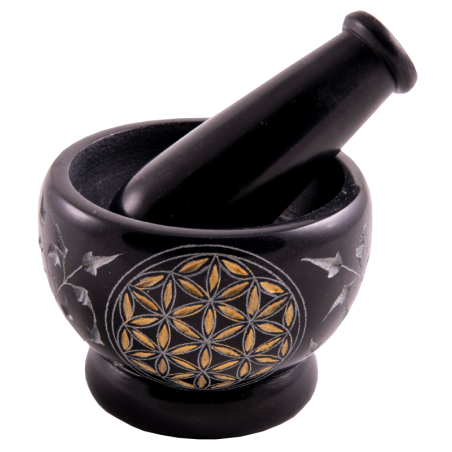 An artistic mortar made of soapstone with engraved flower of life in gold. For energetic crushing of woods, resins or flowers, for mixing pastes of any kind. Versatile and always good to use.