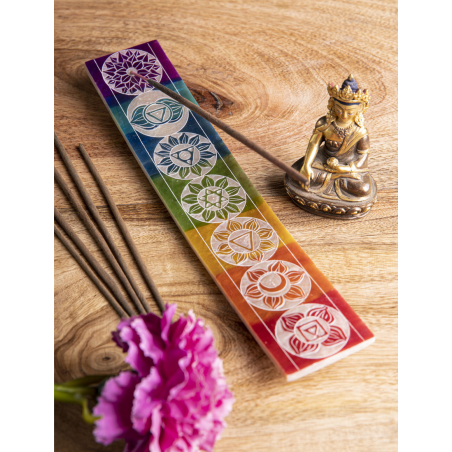 Porte-pierres élégant avec chakras gravés au laser. Pour une ambiance magique et des encensements énergisants.