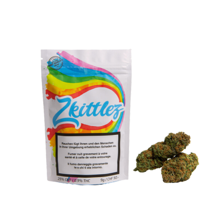 Le parfum fruité-acidulé, légèrement sucré, te ramènera instantanément à tes jeunes années, en te rappelant ces petites perles de sucre colorées que tu aimais tant. Les fleurs de Zkittlez sont extrêmement claires et pleines de saveur. Leur couche épaisse et collante de résine leur confère un taux de CBD respectable de 25 %, avec jusqu’à 0,9 % de THC.
