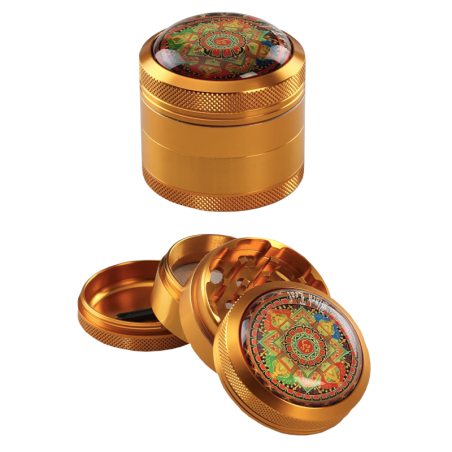Le grinder à 4 pièces de Black Leaf® est en aluminium anodisé Aerospace. Dans le couvercle se trouve un ravissant motif de mandala, rendu très plastique par la coupole en verre.