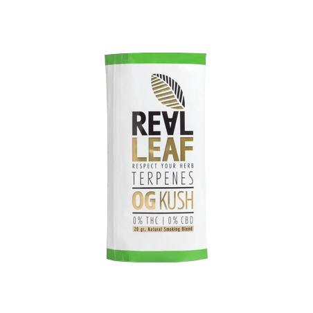 Les substituts de tabac OG Kush avec terpènes de Real Leaf sont un mélange unique de plantes sans tabac et sans nicotine, enrichi de terpènes de Mango Kush