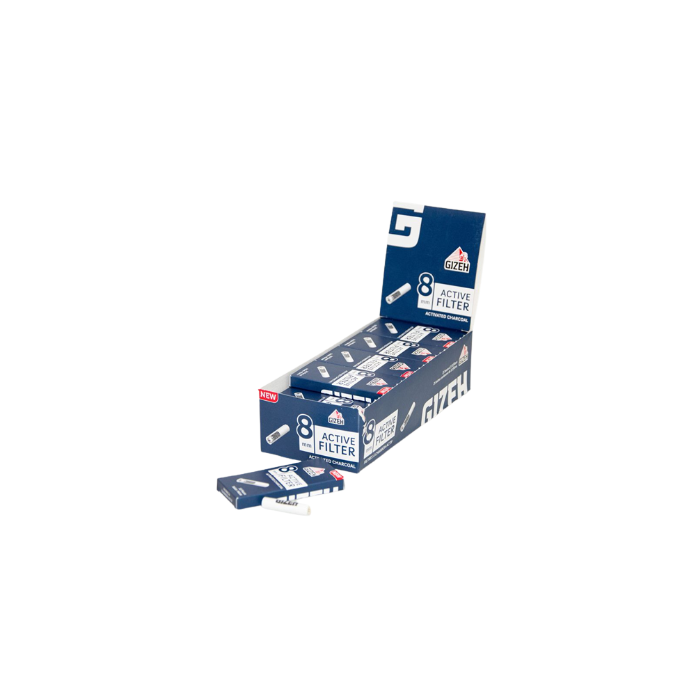 GIZEH Active Filter 8 mm mit Aktivkohle Kokosnuss-Schalen die Aktivkohlefilter im Slim-Format (8 mm Durchmesser) wurden speziell für den King-Size-Genuss entwickelt. Die gereinigte Aktivkohle im Inneren der Filter wird auf Basis von Kokosnuss-Schalen – einem nachwachsenden Rohstoff – produziert. Die Keramikkappen an beiden Enden haben jeweils sieben Löcher und sorgen für einen optimalen Zugwiderstand. GIZEH BLACK® Active Filter sind „Made in Germany“ und können mehrfach verwendet werden. Filterlänge: 35mm