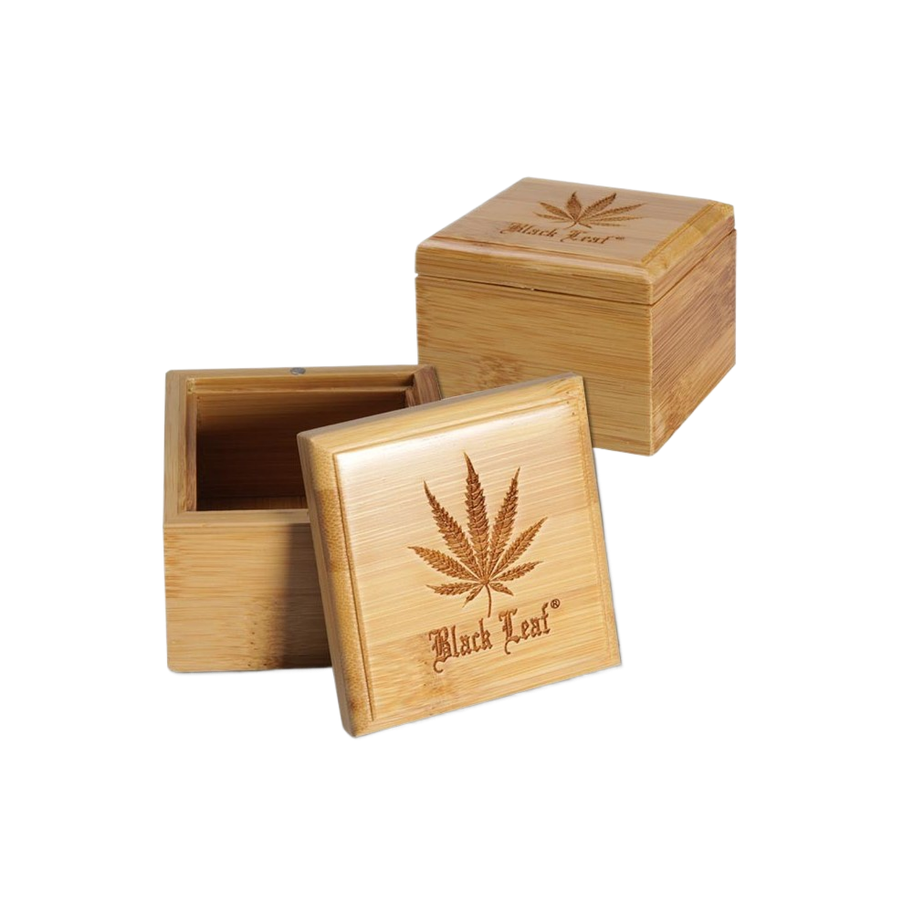 Die ´Black Leaf´ ´Blatt´ Aufbewahrungsbox aus Bambus hat einen Deckel mit Magneten, die im Holz eingelassen sind.