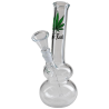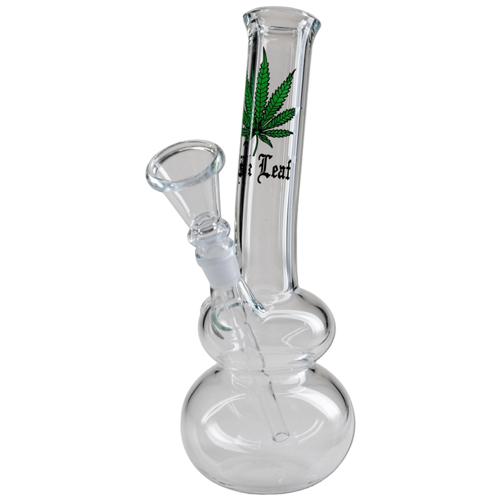 Diese Bong liegt mit ihrer kugeligen Wasserkammr sehr gut in der Hand und lässt sich durch das ergonomisch abgewinkelte Glasrohr bequem rauchen. Sie ist aus Borosilikatglas und mit dem ´Black Leaf´ Logo und Hanfblatt bedruckt. Inkl. Glasshillum und mit Kickloch.