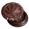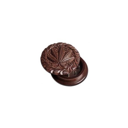 Dieser Holz-Grinder in Form einer Spule ist innen mit Metallstiften ausgestattet. Boden und Deckel sind leicht gewölbt. Der Deckel ist mit einem geschnitztem Blatt-Motiv versehen.
