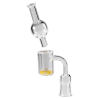 Das Dabbing-Set in der schönen Metalldose enthält einen Banger und einen passenden Carb Cap aus sehr hitzebeständigem Glas. Der Banger enthält ein gelbes Farbgranulat, dass rot wird, wenn der Banger erhitzt wird.