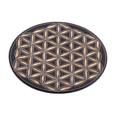 Räucherstäbchenhalter Blume des Lebens aus schwarzem Speckstein mit von Hand gravierter goldener Lebensblume. Ein edler Räucherstäbchenhalter für das besondere Ambiente. Speckstein Schwarz-Gold, ø 13 cm
