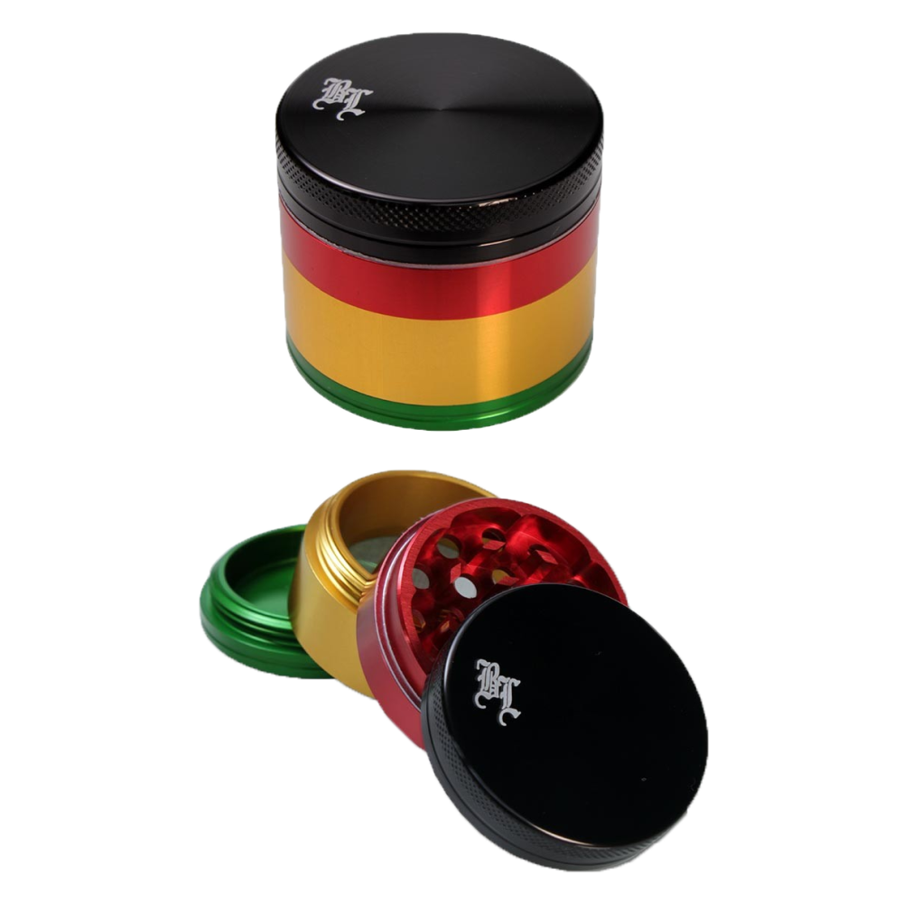 Black Leaf Rasta grinder made of anodised aluminium with magnetic closing lid with nylon ring and a sieve and collecting chamber.