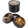 The black grinder Mill aluminum with viewing window has a golden-colored grinder in the design of windmill blades with rotor blades for crushing. The edges in the bottom chamber are rounded, so that the finely ground material with the scraper reminiscent of a plectrum can be emptied almost residue-free. The grinder has a magnetic closing lid, nylon slide ring and an integrated sieve.