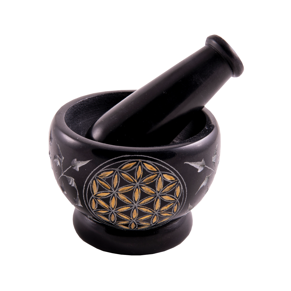 An artistic mortar made of soapstone with engraved flower of life in gold. For energetic crushing of woods, resins or flowers, for mixing pastes of any kind. Versatile and always good to use.