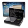 The BLscale digital scale black has a lid attached to the housing with Quick User Guide and stainless steel weighing platform. With CE mark.