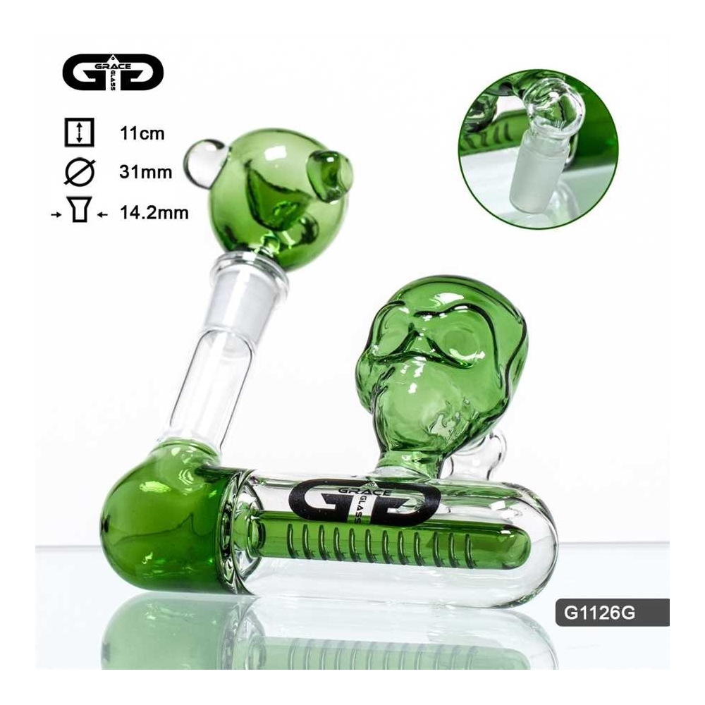 This Skull Grace Glass Precooler is a green colored handheld piece of glass art that will offer you a special hit! It is made of a high quality heat proof borosilicate glass, formed in the shape of a skull. It comes with an 1x12 slot slit diffuser for extra filtering your smoke, providing you this way a cooler toke! A 3 point bowl is used for placing your herb or tobacco. The black Grace Glass logo features at the front of the cylinder chamber. The precooler fits any suitable bong or bubbler joint of 14.5mm diameter.