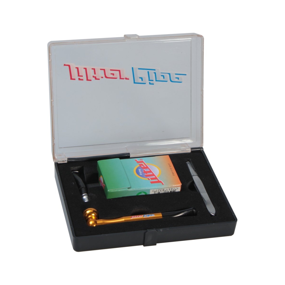 This aluminium pipe is small, light, simple to use and fits in any bag or pocket. It may be dismantled completely and is easy to clean. Included in the delivery are a packet of Jilter filters and a pair of tweezers, with which the filters may be changed. Fresh Jilter filters are placed directly in the pipe mouthpiece, the tweezers enable used filters to be replaced without direct skin contact. A replacement mouthpiece is also supplied.