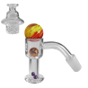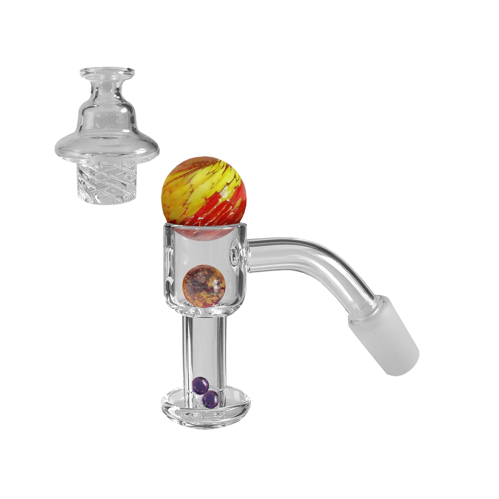 Il existe en outre un Carb Cap. Celui-ci permet de contrôler larrivée dair, ce qui favorise le développement de la vapeur. Le banger est emballé avec le Carb Cap et quatre perles dans une boîte métallique sympa.