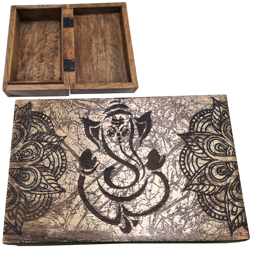 La boîte en bois Ganesha est une boîte de rangement artistiquement conçue avec une gravure de Ganesha détaillée. Ganesha, le dieu hindou de la sagesse et du renouveau, est synonyme de chance, de protection et de dépassement des obstacles.