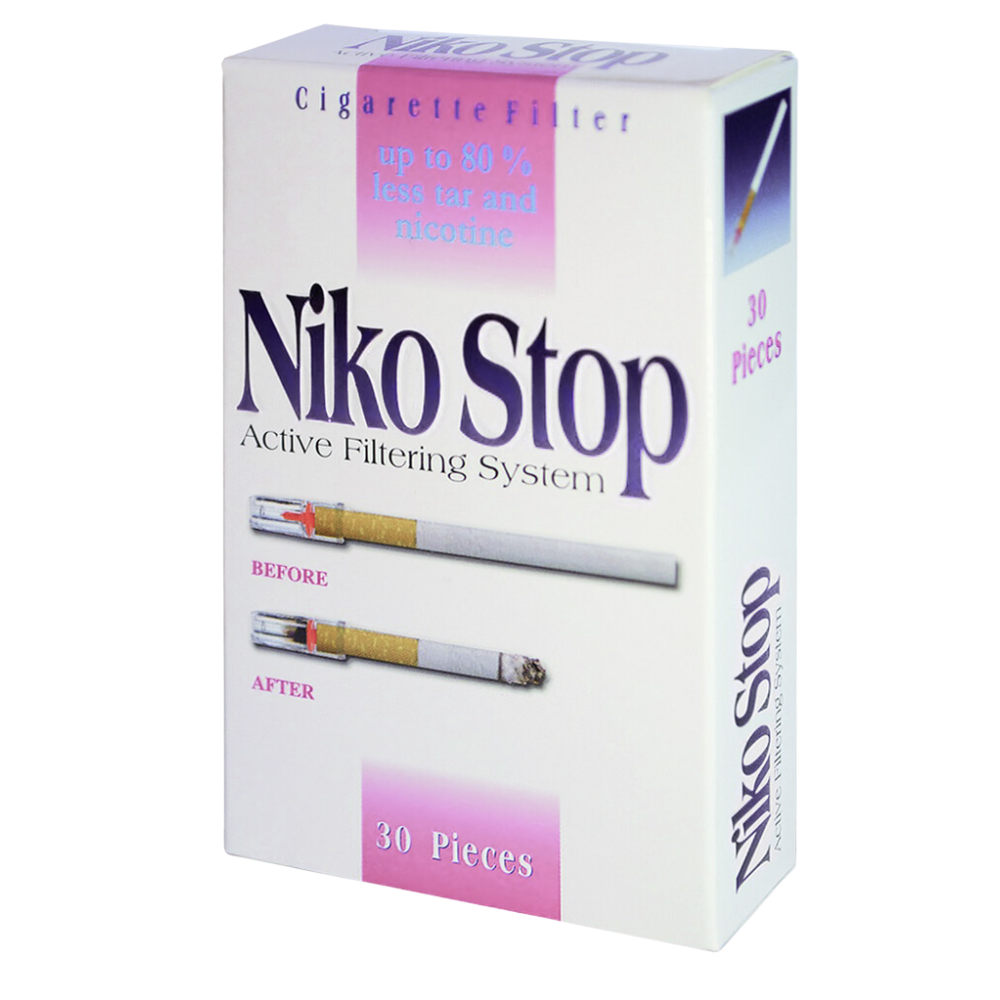 Lorsque l'on fume une cigarette, le filtre Niko Stop réduit jusqu'à 80% le taux de nicotine et de goudron, sans modifier le goût et l'arôme du tabac. Grâce au filtre transparent, les résidus de goudron sont immédiatement visibles.