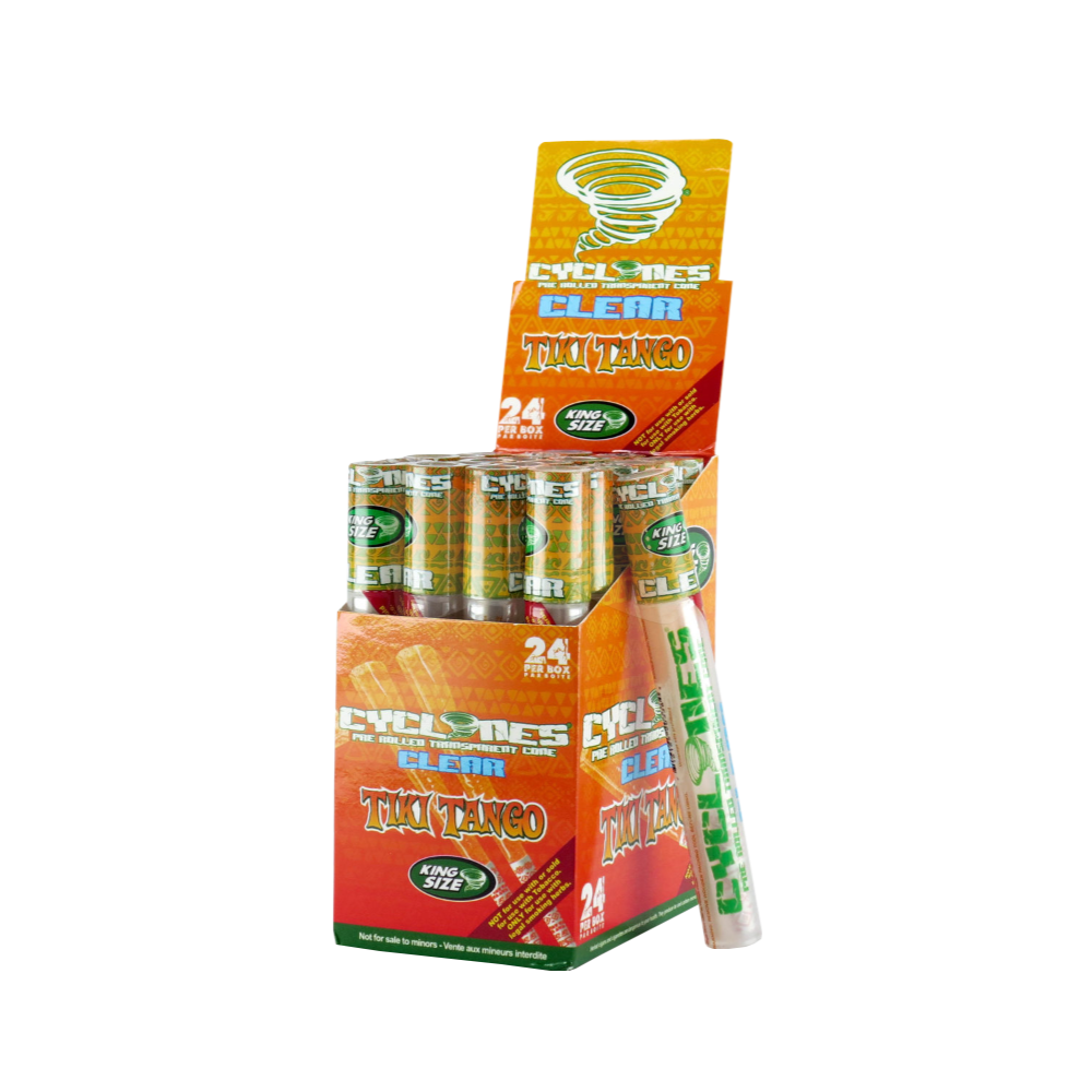 Cyclone Clear est le dernier né des cônes pré-roulés. Ces cônes transparents sont fabriqués à partir dun mélange de glucose, deau et de cellulose de coton et brûlent beaucoup plus lentement que les papes ordinaires. Elles sont toutes naturelles, légères et se présentent dans un récipient pratique qui peut être utilisé pour le stockage après lempaquetage. Les cônes ont une longueur de 105 mm.
