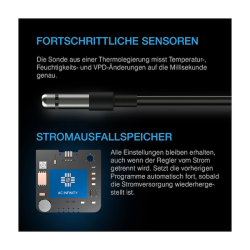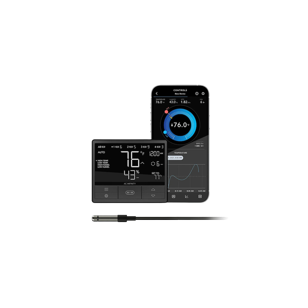 Un contrôleur de nouvelle génération qui équipe les appareils AC Infinity d'une programmation intelligente pour créer des conditions climatiques optimales. Cette unité de contrôle centrale peut être connectée à jusqu'à quatre appareils différents, des ventilateurs aux Grow Lights, et offre à chaque appareil une programmation climatique et temporelle indépendante. L'écran rétro-éclairé affiche la température en degrés Fahrenheit ou Celsius et peut être éteint pendant que les programmes fonctionnent en arrière-plan. Il est équipé d'un pied et peut être fixé au mur grâce aux supports fournis. La sonde de mesure avec tête en alliage thermique mesure avec précision la température et l'humidité actuelles. Elle détecte également le déficit de pression de vapeur (VPD), qui mesure la température ambiante, l'humidité relative et la température des feuilles de la plante, afin de déterminer l'atmosphère optimale. Tu peux ainsi surveiller les conditions de croissance avec plus de précision que si tu te fiais uniquement à la température et à l'humidité de l'air. Ce produit fait partie de la plateforme UIS d'accessoires et de contrôleurs intelligents conçus pour s'intégrer les uns aux autres afin d'obtenir ton environnement idéal.