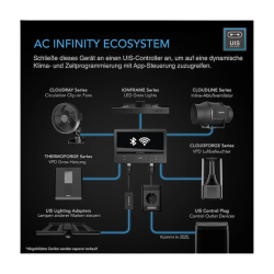 Les appareils au sein de l'écosystème UIS, qui comprend tous les projecteurs LED AC Infinity et les ventilateurs EC, sont compatibles. Deux dongles adaptateurs sont inclus pour la connexion des ventilateurs à moteur EC avec des connecteurs Molex à 4 pôles. Les appareils compatibles de la série AC Infinity comprennent :