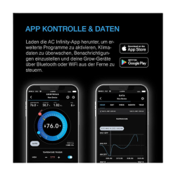 Connecte jusqu'à quatre appareils pour les programmer ensemble ou indépendamment les uns des autres. Avec des programmes dynamiques qui adaptent la vitesse du ventilateur et l'intensité de la lumière en fonction de la température, de l'humidité et du VPD, tu peux régler plus que le simple fait d'allumer et d'éteindre. Définis des valeurs minimales auxquelles tes appareils fonctionnent de manière constante et qui ne sont augmentées que lorsque les déclencheurs sont activés. Les modes minuterie, cycle et horaire permettent une activation à la demande pour une multitude de projets de culture en intérieur. Connecte-toi en toute sécurité à l'application AC Infinity via Bluetooth ou WiFi pour accéder à distance à tes appareils, débloquer des programmes, régler des alarmes et des notifications, consulter des graphiques historiques et exporter des données CSV.