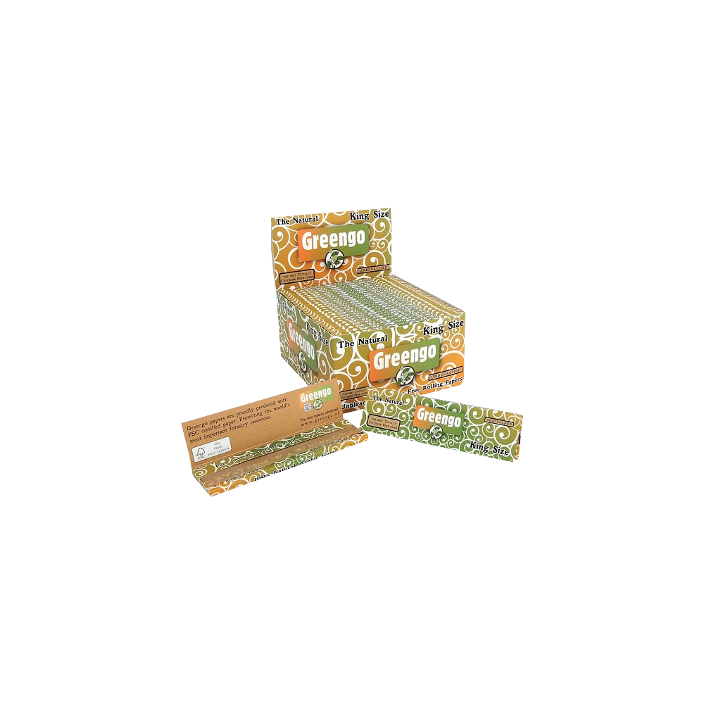 Le papier Greengo est fabriqué à partir de pâte de bois certifiée FSC. Les papiers à rouler Greengo ont une épaisseur idéale de 14 g/m2. Les embouts filtrants sont fabriqués à partir de papier recyclé de 140 grammes. Même le paquet de papiers à rouler Greengo se compose entièrement de papier recyclé de 200 g/m2.