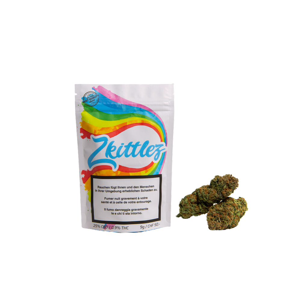 Le parfum fruité-acidulé, légèrement sucré, te ramènera instantanément à tes jeunes années, en te rappelant ces petites perles de sucre colorées que tu aimais tant. Les fleurs de Zkittlez sont extrêmement claires et pleines de saveur. Leur couche épaisse et collante de résine leur confère un taux de CBD respectable de 25 %, avec jusqu’à 0,9 % de THC.