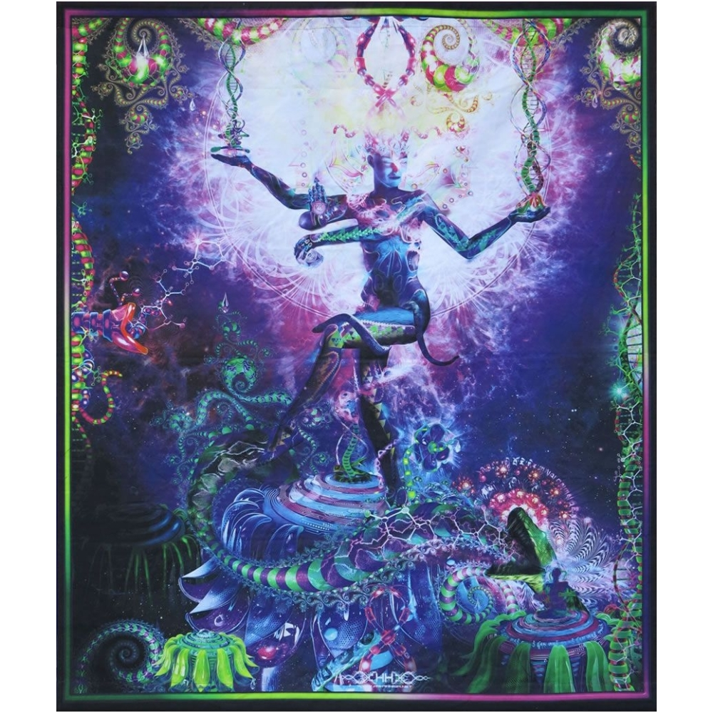 Imprimé non pas avec des encres UV, mais sur du lin actif aux UV, doù un certain effet UV.